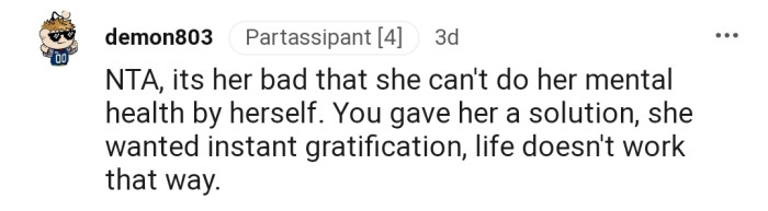 Many Reddit users find it more concerning that OP made some reasonable suggestions, which she turned down, almost as if their own mental health doesn't matter.
