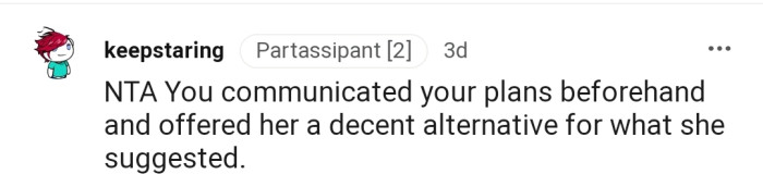 "NTA...You communicated your plans beforehand and offered her a decent alternative"