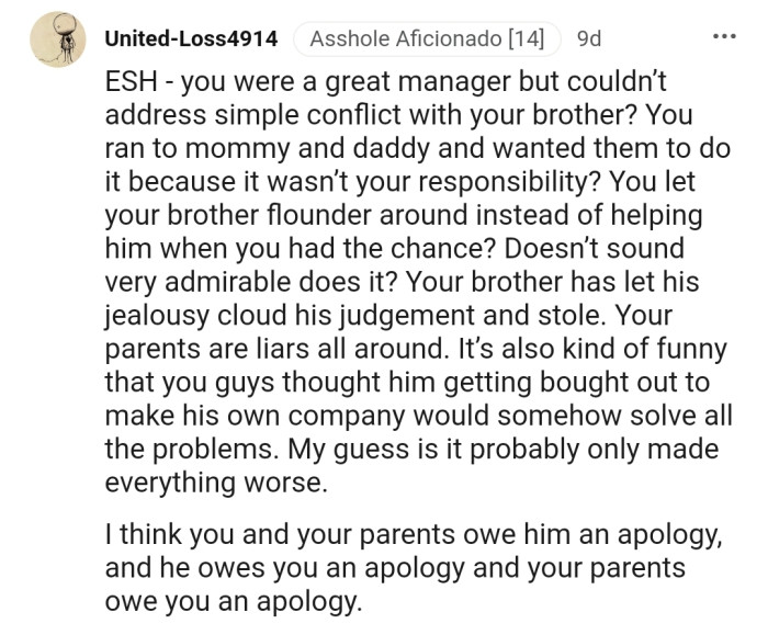 OP shared on the AITA subreddit that he used to run a company with his brother and parents. While he was thriving and progressing in his role, his brother struggled with management.