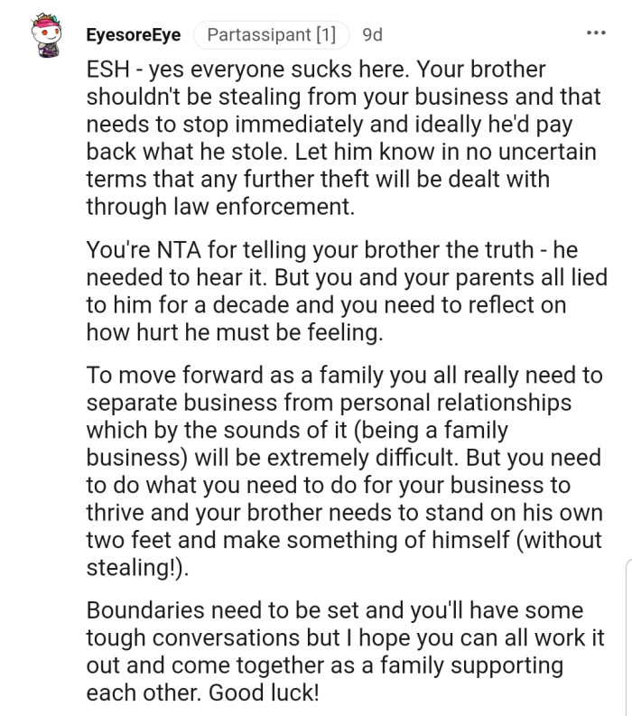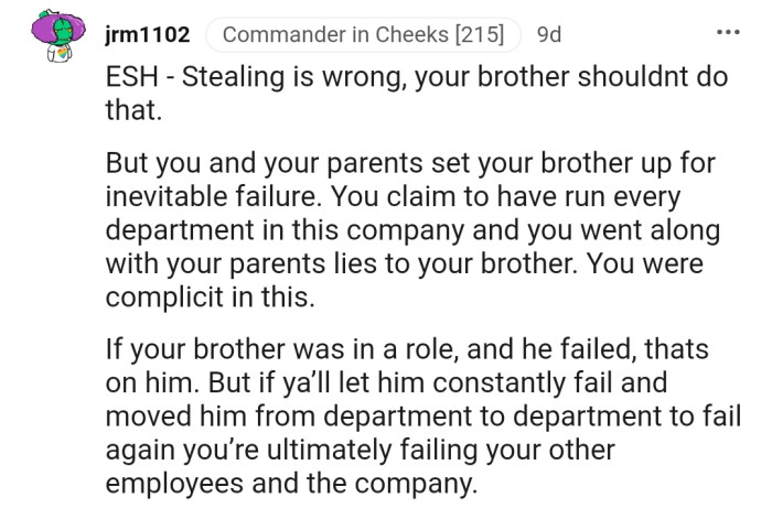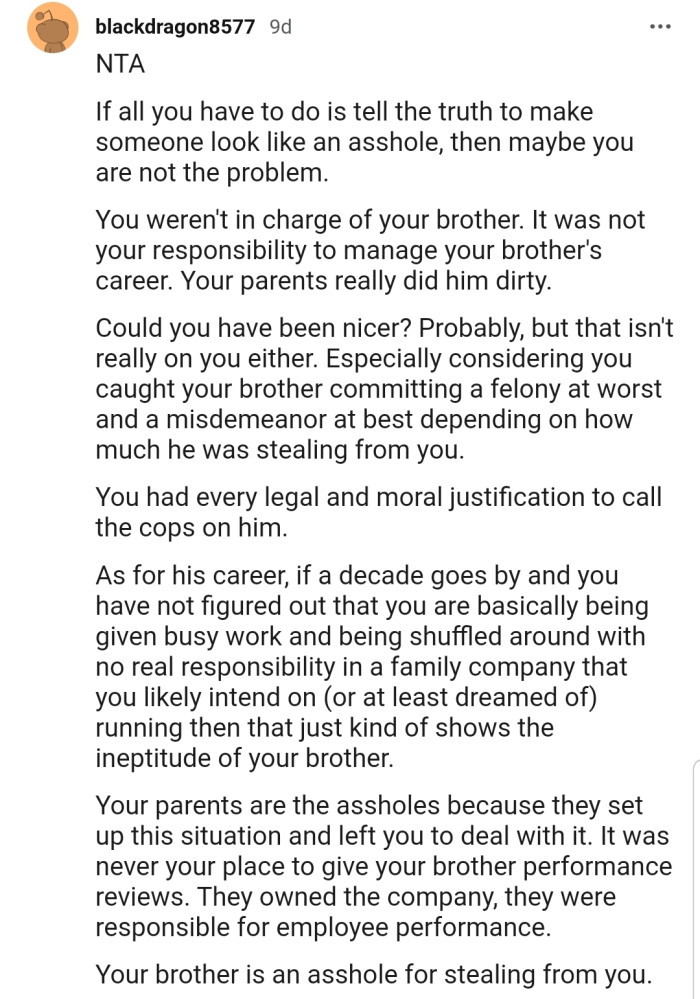 Reddit.comOP explained that he runs a family business alongside his parents and brother, who has always struggled when given any real responsibility. However, OP and his parents decided it was best to cover his shortcomings to avoid hurting his feelings.