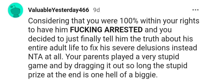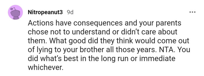 Undoubtedly, everyone agrees that OP and his parents should have been honest with his brother from the beginning. The only way forward now will be for everyone to sit down and have an honest conversation about how to move forward as a family.