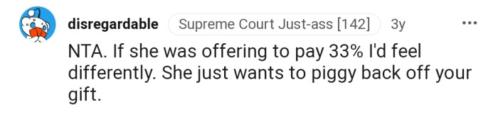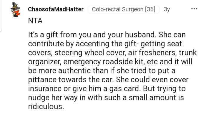 They believe she is trying to leech off OP and their husband’s gift. The commenters also suggested other gifts that she could give her son to complement the car gift, including buying him a car wash kit.
