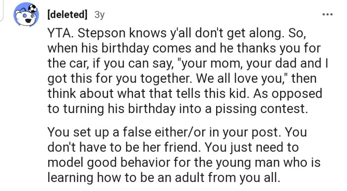 A majority of commenters believe that OP is NTA. However, they don’t feel the same about OP’s stepson’s mother.