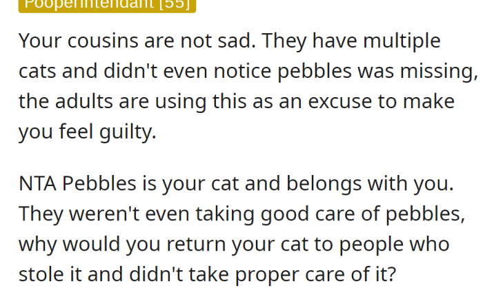 However, before long, the OP moved into a pet-friendly apartment and was able to request Pebbles back. Unfortunately, her relatives refused to return her cat, mentioning that their daughters had developed an attachment to her.