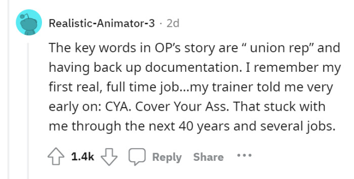 "The key words in OP's story are 'union rep' and 'backup documentation'..."