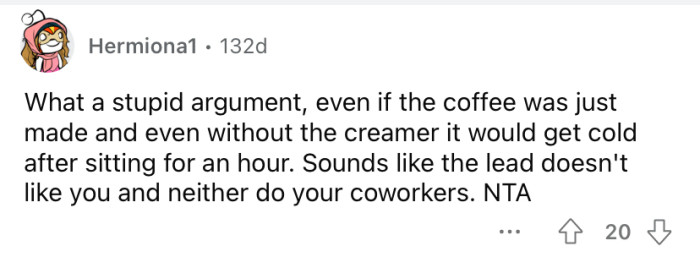 The Redditor was confused by her question because the coffee had stayed hot for more than four hours, so it should have still been piping hot. However, the OP's coworker looked at him with a straight face and said, "You're lying."