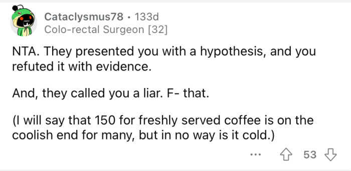 Reddit/PeePeeInspector3000One of the OP's colleagues accused him of lying.