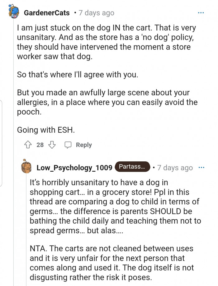 Some believe OP is the A-hole as they could have avoided the dog by shopping in a different aisle and also because they didn’t exhibit allergy symptoms during their time with the dog.