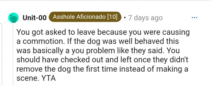 "You should have checked out and left once they didn't remove the dog the first time instead of making a scene. YTA."
