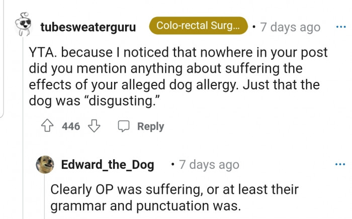 "I noticed that nowhere in your post did you mention anything about suffering the effects of your alleged dog allergy."