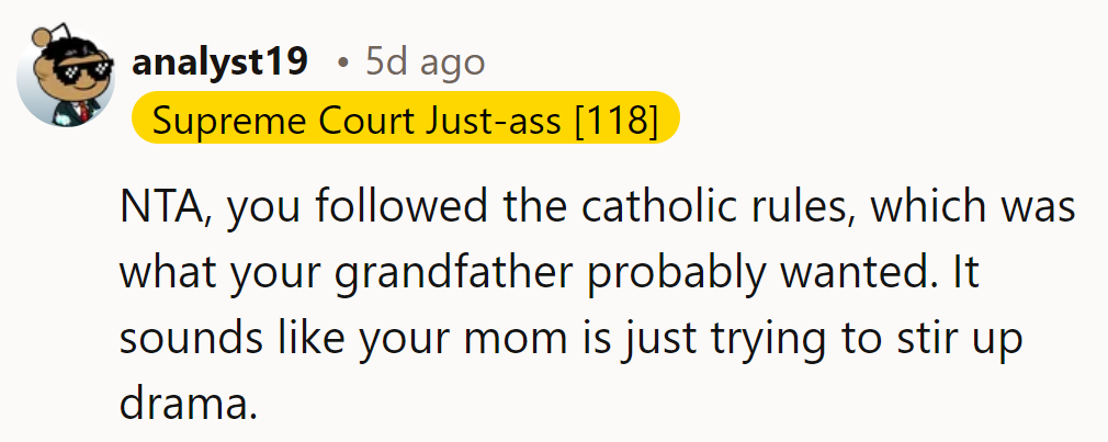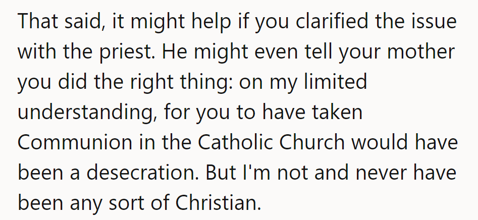 Her mother, already grieving the loss of her father, expressed embarrassment and disappointment over her daughter's choice. Despite the clear directive from the priest and her own conviction to stay true to her current beliefs, the woman's decision to abstain was seen as a slight against family unity and respect for her grandfather's traditions.