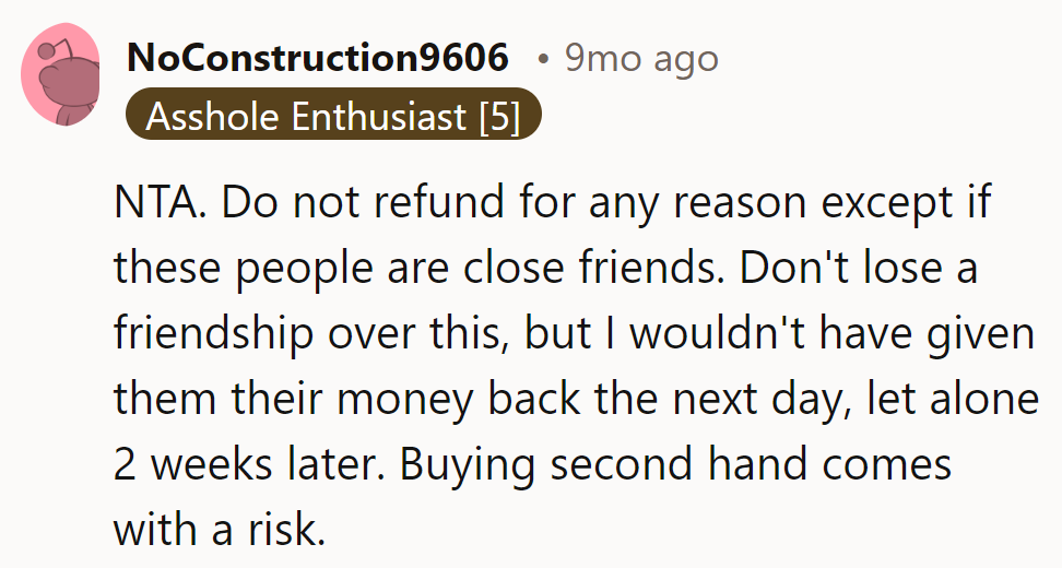 This situation underscores the complexities of consumer transactions, particularly regarding expectations and responsibilities. The seller's stance reflects a common viewpoint that buyers should assume some level of risk when purchasing used items; however, this perspective can overlook the importance of trust and accountability in fostering positive buyer-seller relationships.