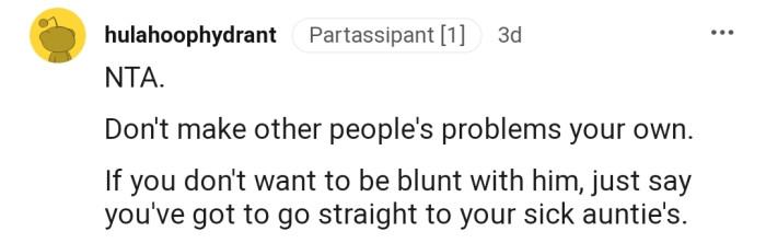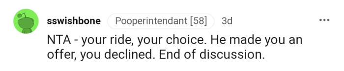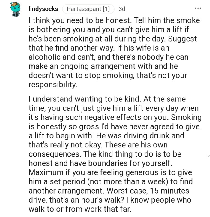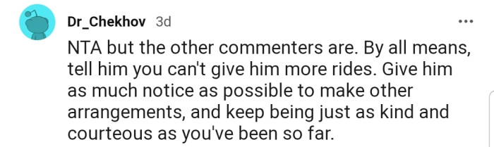OP then shared with the community that he intended to tell his colleague he wouldn’t give him rides anymore but was afraid this would make him the AH.