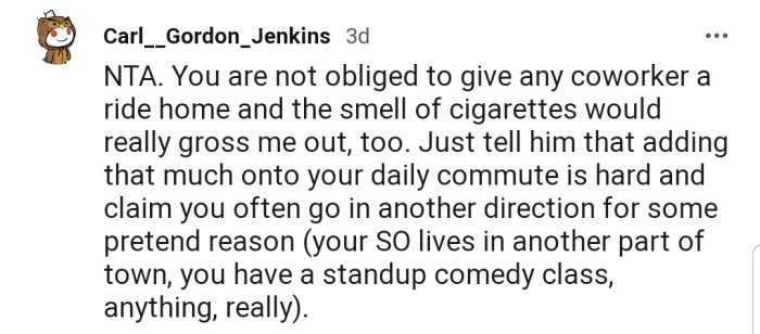 "You are not obliged to give any coworker a ride home and the smell of cigarettes would really gross me out, too"