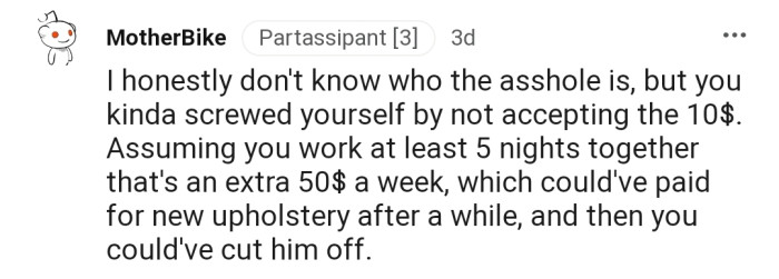 Although he offered him $10 a day for gas, OP wasn’t interested in continuing to provide his colleague rides for some reasons.