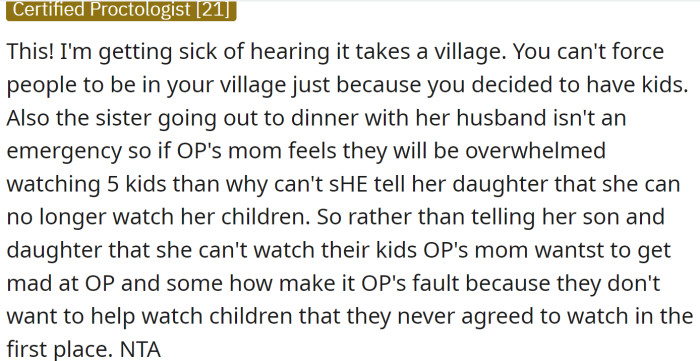 Regarding the main character's situation, it's possible that his mother's persistent pressure to babysit was her attempt to encourage him to love children and possibly want to have some of his own. However, it's important to respect others' choices and preferences when it comes to having children and forcing someone to babysit is not the solution.