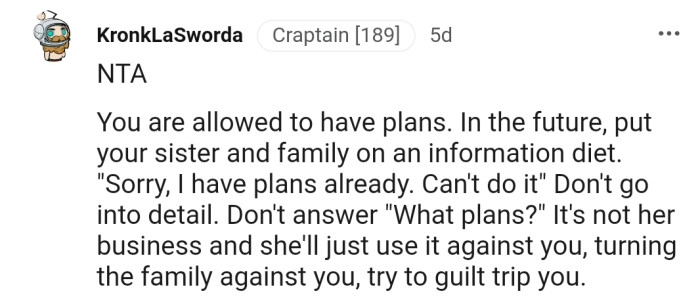 "You are allowed to have plans. In the future, put your sister and family on an information diet."