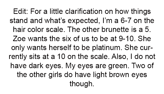 The initial plans for dresses, makeup, and accessories seemed reasonable, even the request for blue contacts. However, the situation took a contentious turn when Zoe requested that all bridesmaids bleach their hair to match her vision of a perfect day.