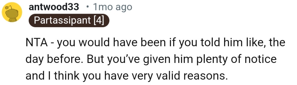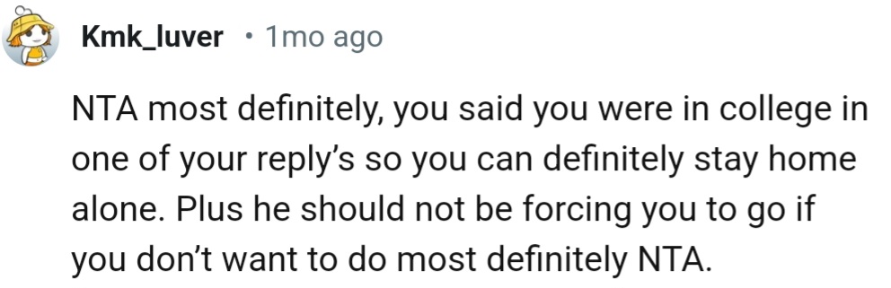 Redditors couldn’t blame OP for opting out of another forced family bonding session. Brian needed to chill out and understand that not everyone’s dream vacation involved awkward small talk with semi-strangers.