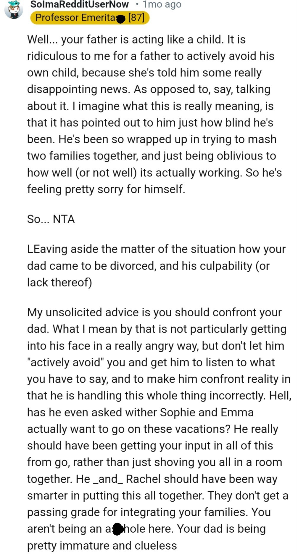 OP's dad, Brian, divorced their mom and now goes on vacations with girlfriend Rachel and her kids, whom OP and their sister rarely see since they live out of state.
