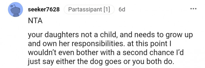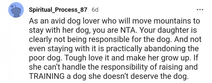 What do you think about OP asking her daughter to move out or rehome the dog? Let us know your thoughts in the comments below!