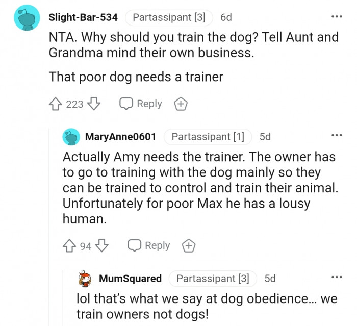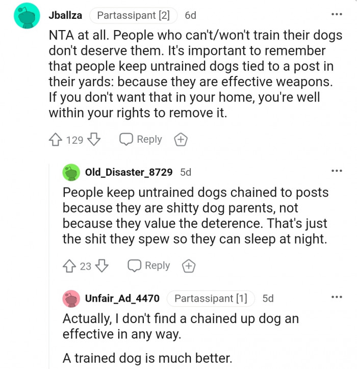 "NTA at all. People who can't/won't train their dogs don't deserve them."