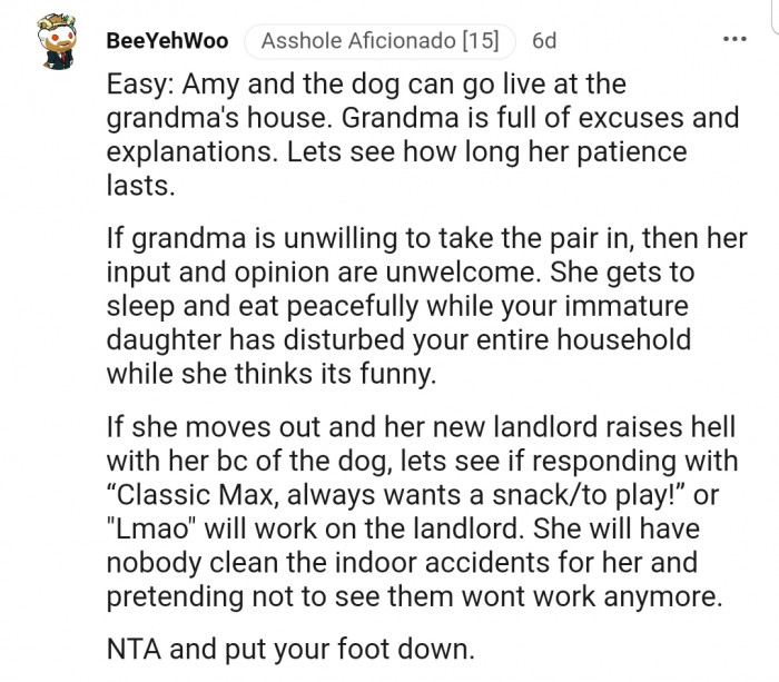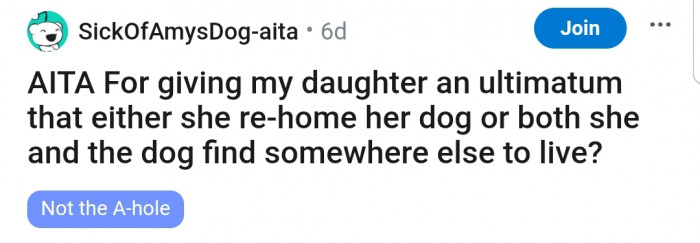 OP kept managing this until the dog hit her last nerve and she asked her daughter to either rehome the dog or move out of the house with it. This led her to ask the AITA question.