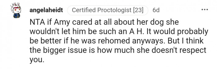 "NTA if Amy cared at all about her dog she wouldn't let him be such an A H."