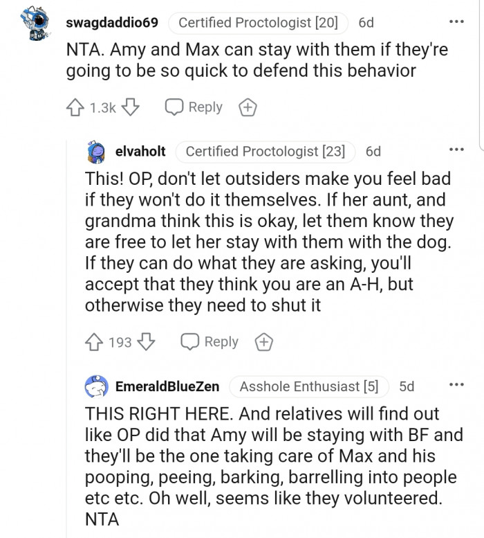 According to them, since OP made it clear that she didn’t want a dog and Amy had assured her that she would take care of the dog, OP is NTA.