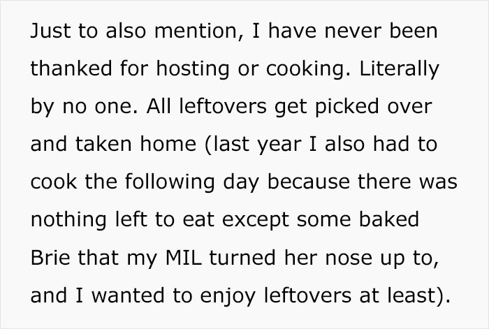 According to u/FinalBlackberry, she begins preparing the night before, cooking the entire morning and evening, and when everything is done, she’s too worn out to even consider partaking in the food she prepared. Since she bears practically all the responsibility for the occasions, she concluded that she's too tired to even think about doing it this year.