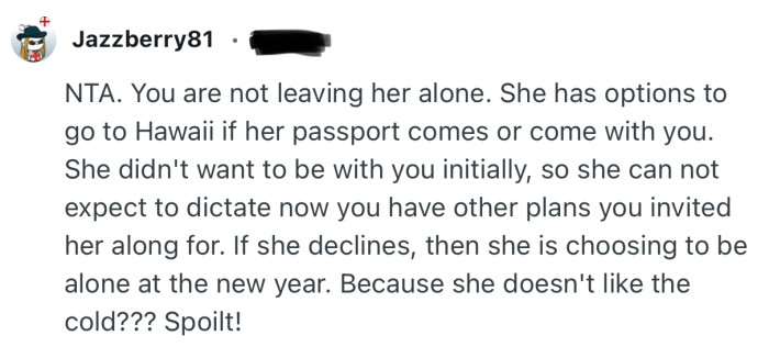 The fact that OP still made efforts to include her in his plans, only for her to reject them, makes matters worse. As one Redditor said, she is the one choosing to be alone this holiday.