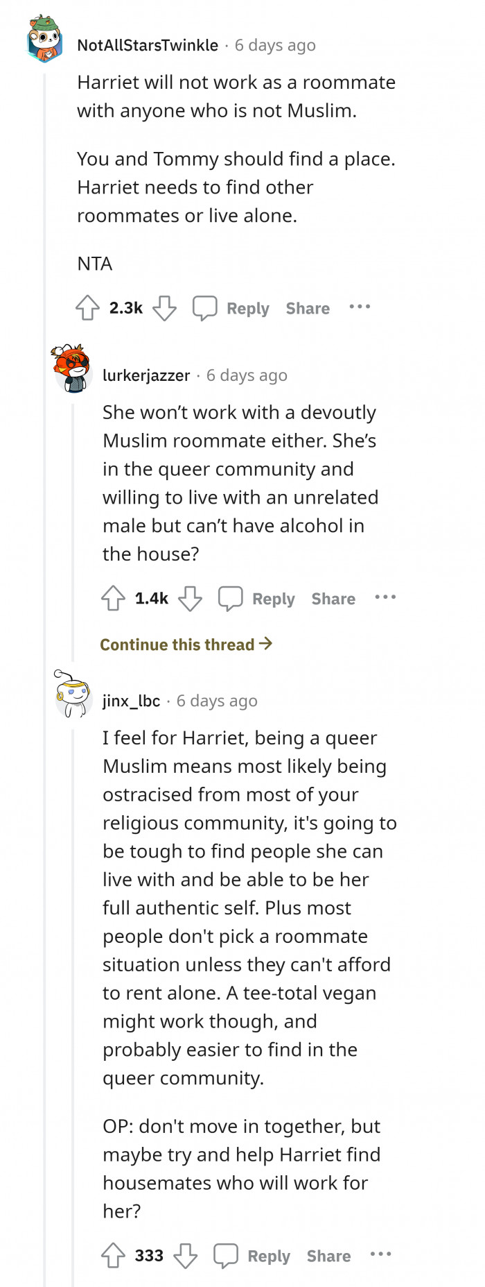 "Harriet will not work as a roommate with anyone who is not Muslim."