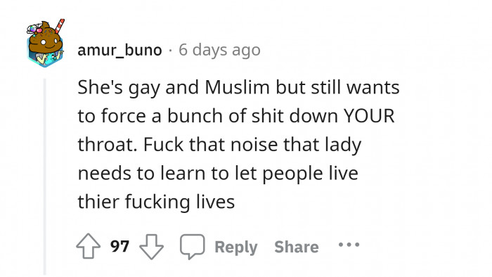 Reddit/u/Traditional-Bed-9731"If she can only live with people who follow strict Muslim laws, then maybe she shouldn't have lived with you."