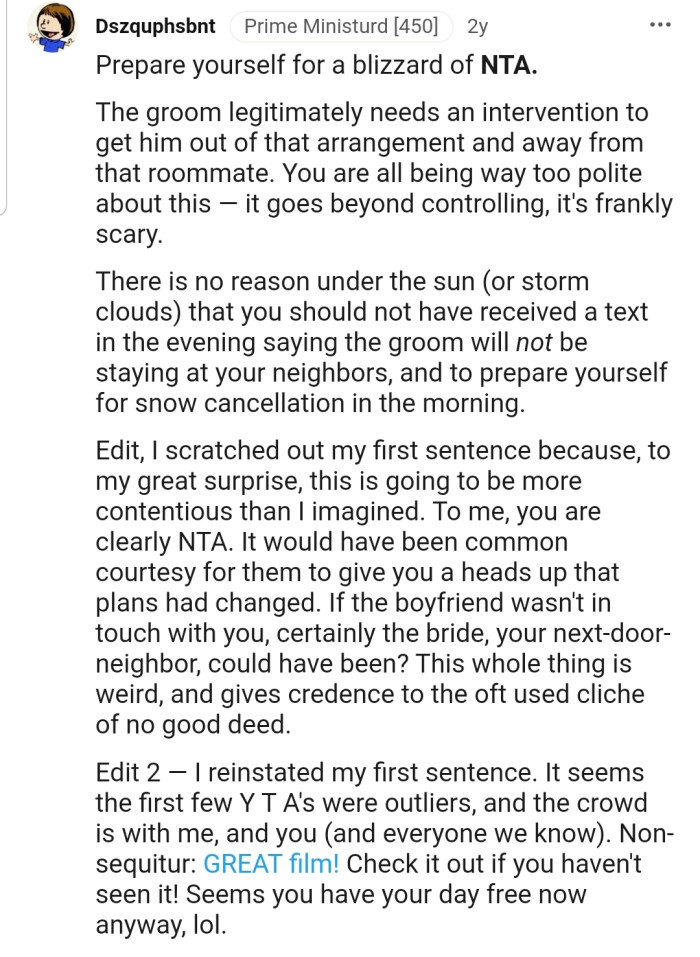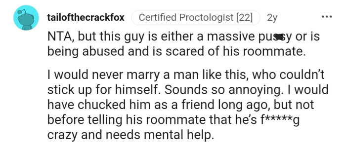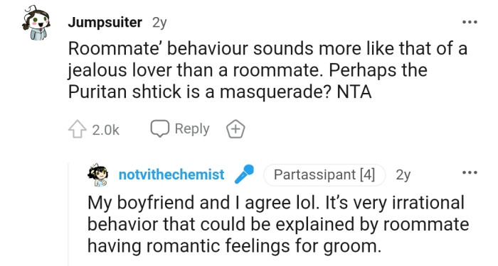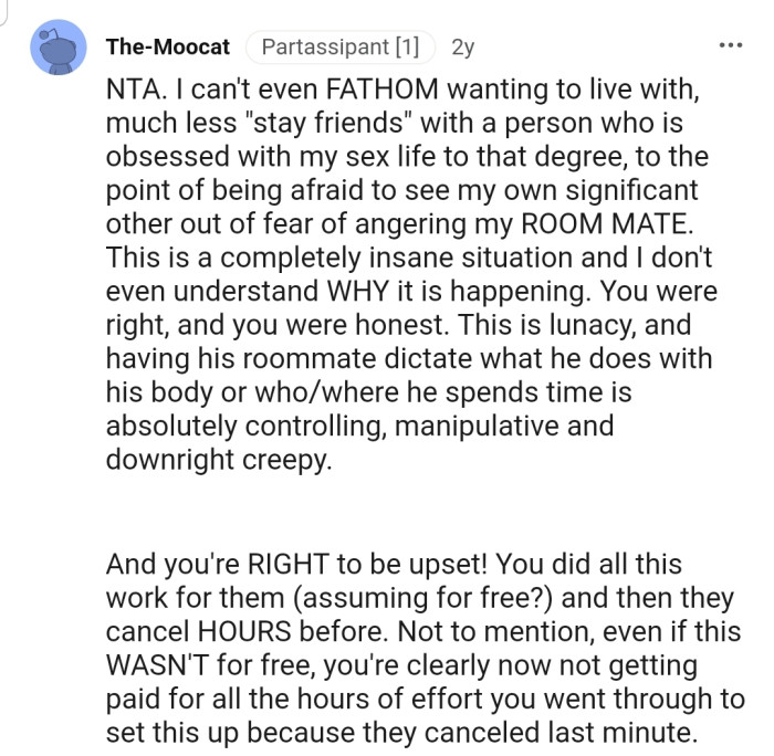 This Reddit community has overwhelmingly agreed that OP is justified in lashing out at the couple. They can't understand why the groom would allow his roommate to have this much control over his life.