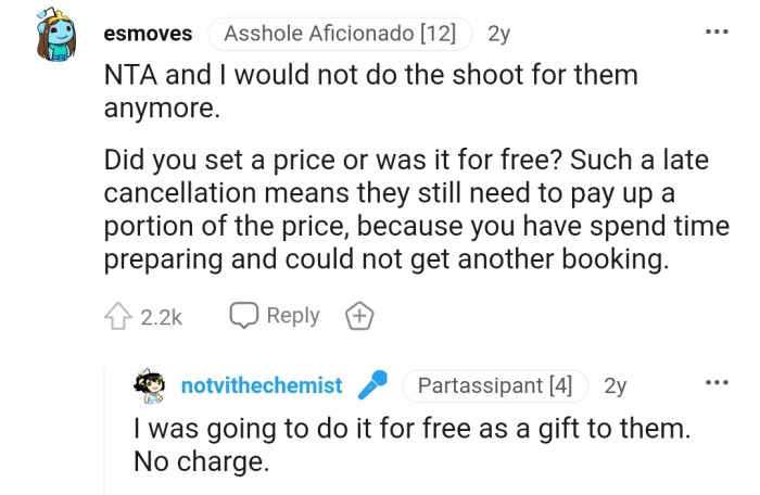 This Redditor is adamant that OP shouldn't do the shoot for free anymore