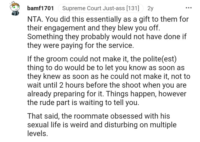 As the day of the photoshoot approached, OP and the couple had everything planned. But to OP's surprise, the groom's fear of angering his roommate led to a last-minute cancellation.