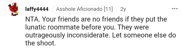 "NTA. Your friends are no friends if they put the lunatic roommate before you."