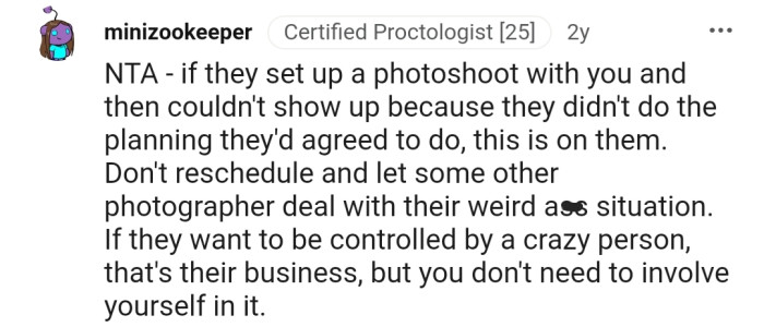 "Don't reschedule and let some other photographer deal with their weird ass situation."