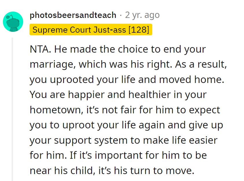 The decision to move often involves weighing the benefits of emotional and familial support against the importance of maintaining the physical presence of both parents in the child's life. This balance is crucial but hard to achieve, as seen in the Reddit post in question.