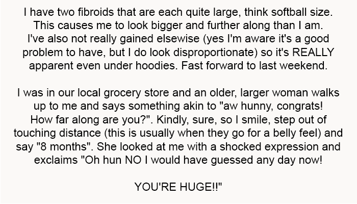 Due to two large fibroids, her pregnancy bump appears more pronounced, leading to even more remarks. During a recent trip to the grocery store, an older woman’s comment about her size prompted a snarky reply that has divided opinions.
