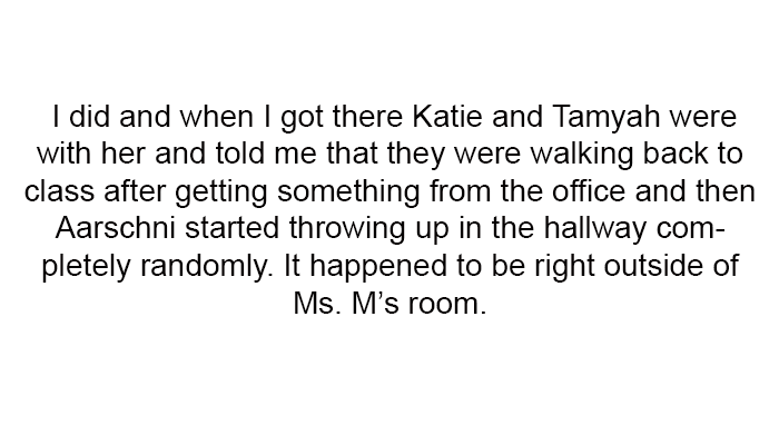While watching over Tamyah's friend, Aarschni, who was staying with them during her mother's work trip, the mother received a call to pick up Aarschni from school after she vomited unexpectedly in the hallway. The event occurred right outside Ms. M's classroom, where Ms. M reacted by handing the children paper towels and returning to her classroom without ensuring Aarschni received proper care.