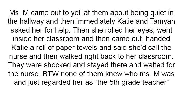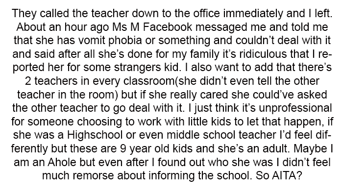 Despite this, the mother stood by her decision, believing that Ms. M's actions were unprofessional and inappropriate for an elementary school teacher.