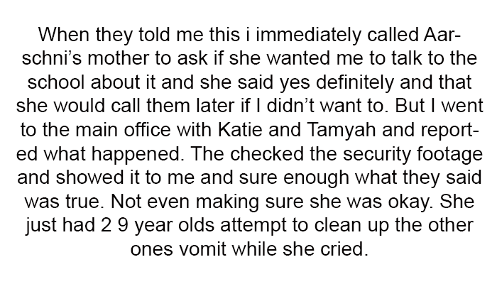 Disturbed by Ms. M's response, the mother reported the incident to the school administration, who verified the children's account through security footage. This action led to a confrontation with Ms. M, who defended herself by claiming a phobia of vomit and referencing the help she had provided to the family during Tanara's illness.