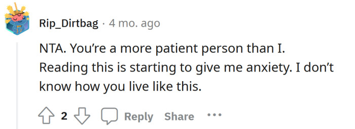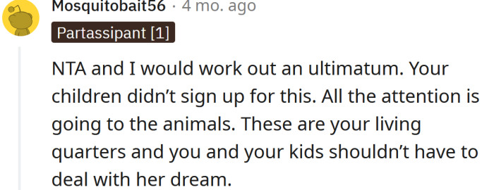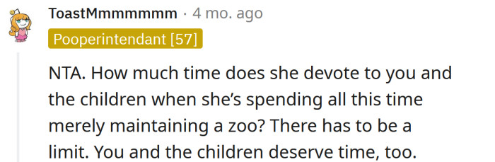 The Redditor's wife spends hours each day caring for the animals and cleaning up after them. However, the OP says his limit has finally been reached.