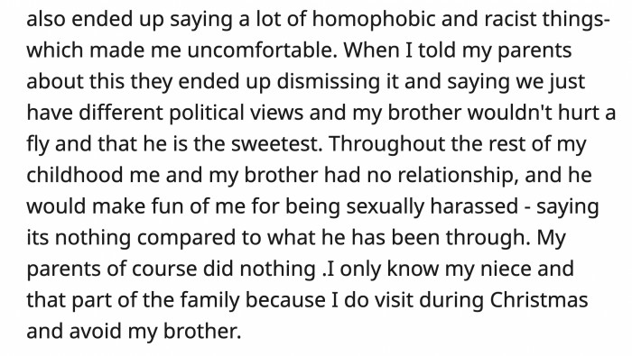 OP knew from a very young age that there was something off about her family, especially her brother. He first picked on her for being a feminist and for experiencing sexual assault.