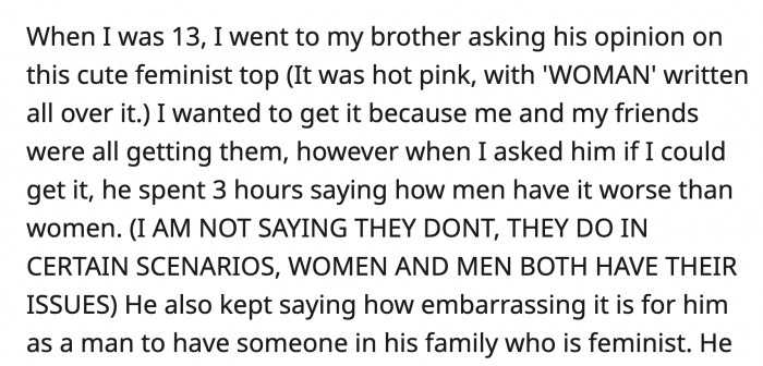 When OP was 13 years old, she asked her brother's opinion about a hot pink shirt with the word 'WOMAN' written on it that she wanted to buy with her friends. In response, he gave her a three-hour lecture explaining how men have it worse than women.