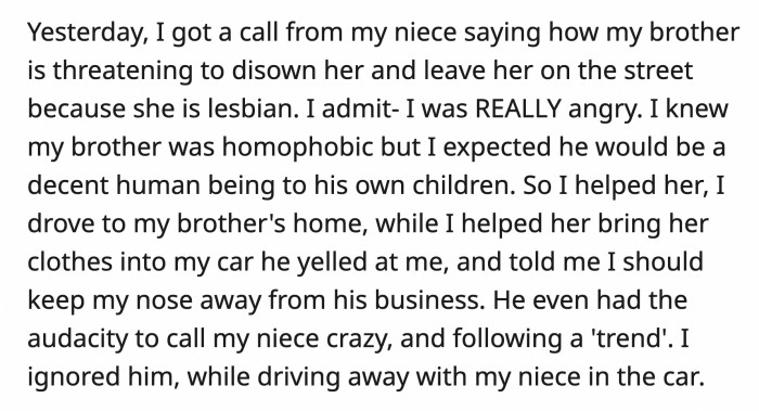 Her niece called her, saying her dad is threatening to disown her because she is a lesbian.