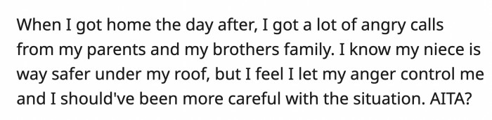 BasketAffectionate58OP knows she can provide a safe space for her niece, but she admits she let her emotions dictate her actions. Is OP an a**hole for helping her niece run away?