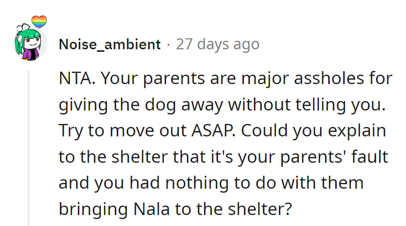 In this case, the parents' decision to send the dog to a shelter may reflect deeper issues within the family structure, such as unresolved tensions or the need for control. This behavior can be symptomatic of a lack of effective communication strategies within the family, leading to misunderstandings and emotional rifts.