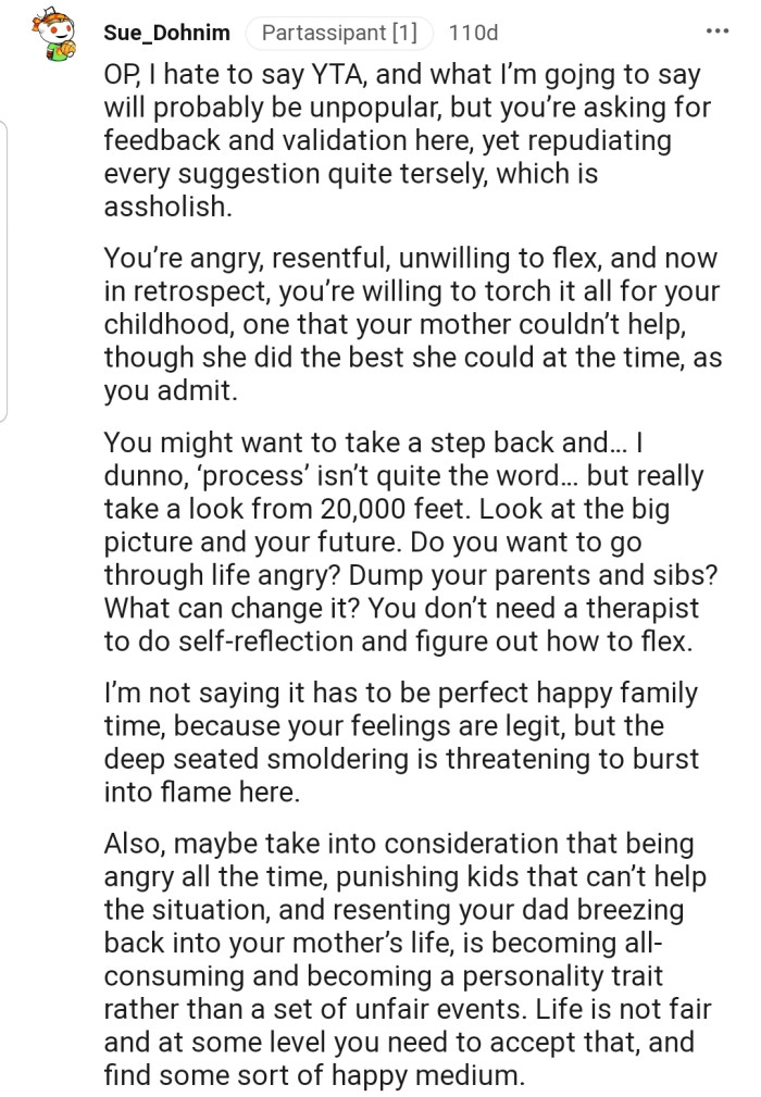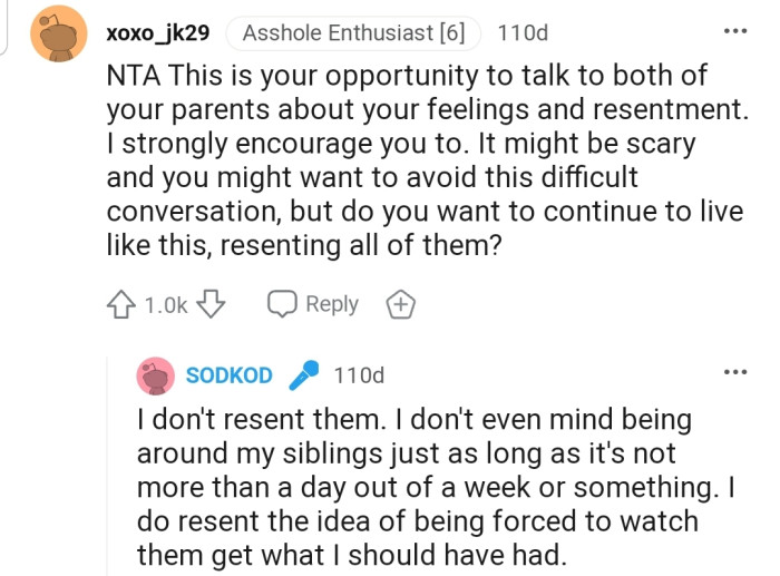 This realization stung, as she felt cheated out of the perfect childhood. Why did her younger siblings get to have this beautiful life while she did not? The thought of this made OP grow distant, and her college breaks home became shorter over time.